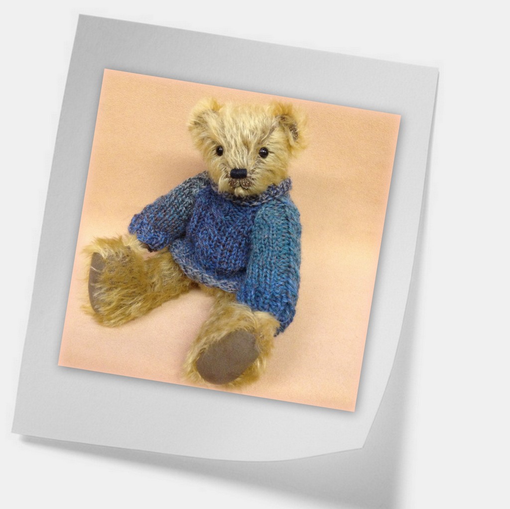 About 9 inches in size, he has a "take me home" expression and wears a lovely hand-knit cable sweater.